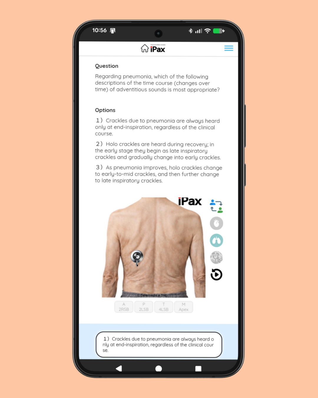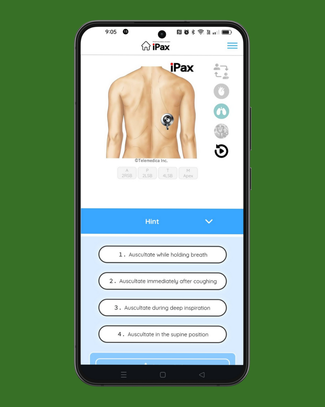 3.iPax将启动,并可进行听诊操作(点击胸部插图以聆听声音)。