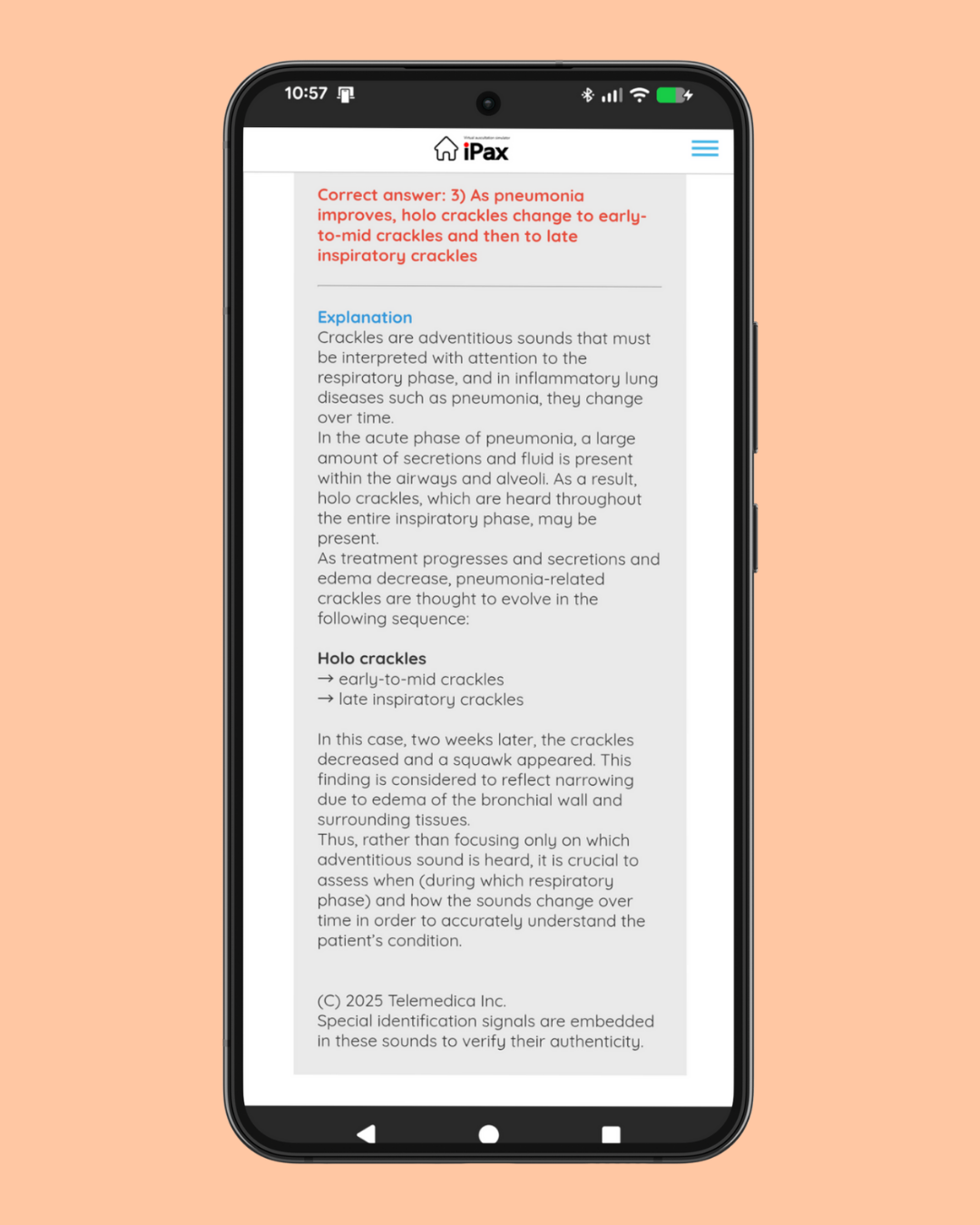 ■12月24日的病例为一名 70岁误吸性肺炎患者。在 左下肺野 可听到 Holo crackles,本测验将讲解 这些啰音在恢复过程中如何发生变化。